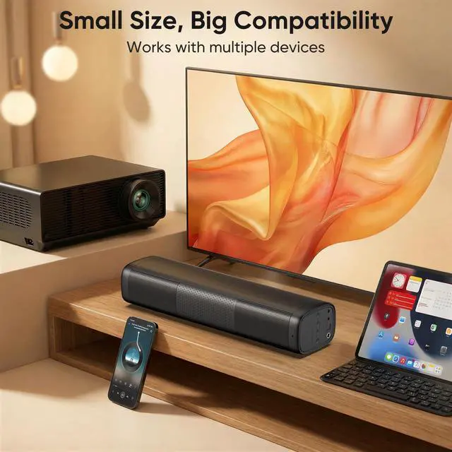 Compact Design, Big ImpactMeasuring just 11.7" x 3.5" x 2.5", this sleek soundbar fits effortlessly under any screen or on tight shelves, making it the perfect space-saving sound bar for smart TV setups.