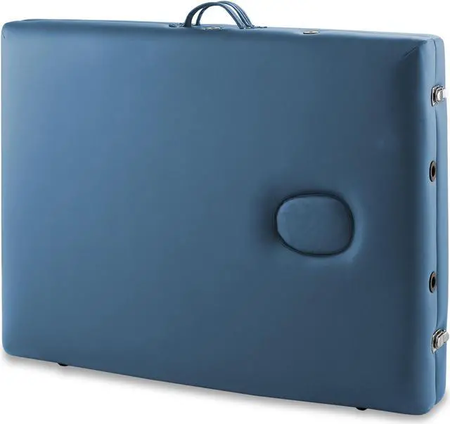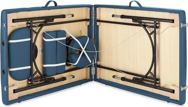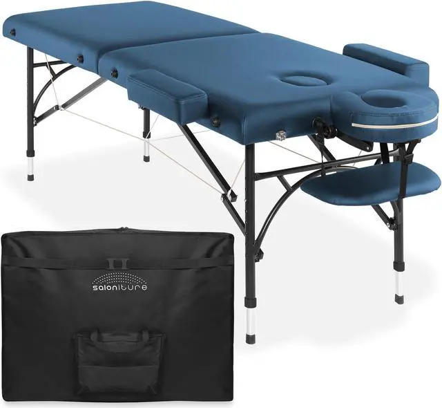 Saloniture Professional Portable Lightweight Bi-Fold Massage Table with Aluminum Legs - Includes Headrest, Face Cradle, Armrests and Carrying Case Blue