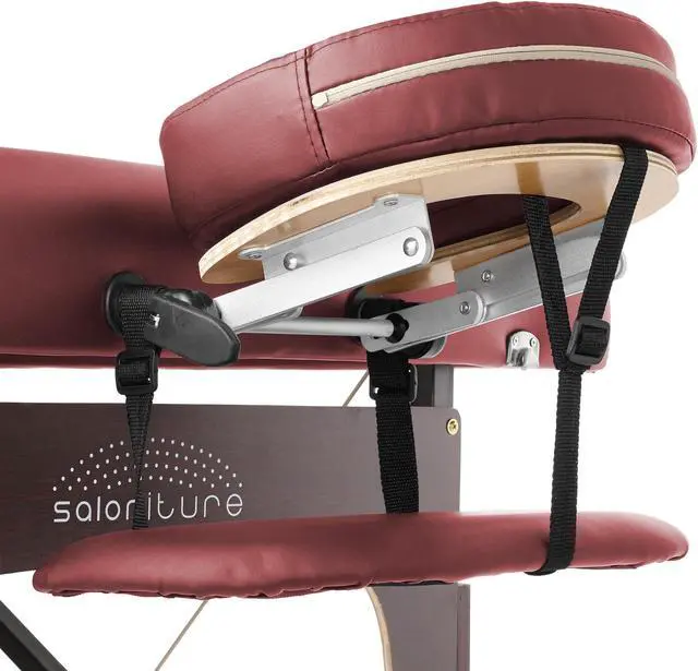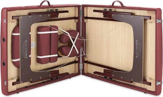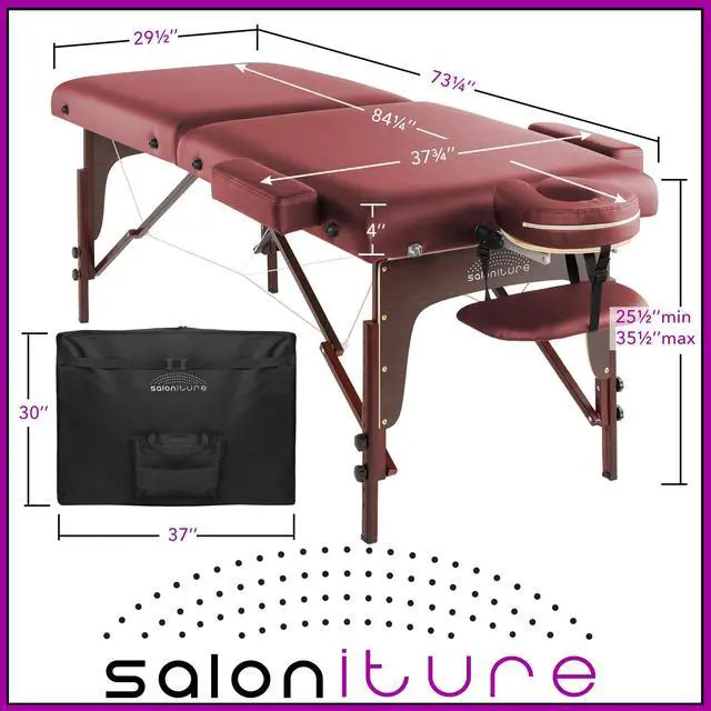 This Saloniture portable massage table combines luxurious comfort in a convenient, fold-and-carry design ideal for both certified massage therapists, as well as at-home bodywork enthusiasts. The table features professional-grade craftsmanship, including a sturdy hardwood frame, Mahogany hardwood legs, Reiki panels and durable steel support cables, designed to accommodate a maximum weight capacity up 450 pounds.