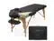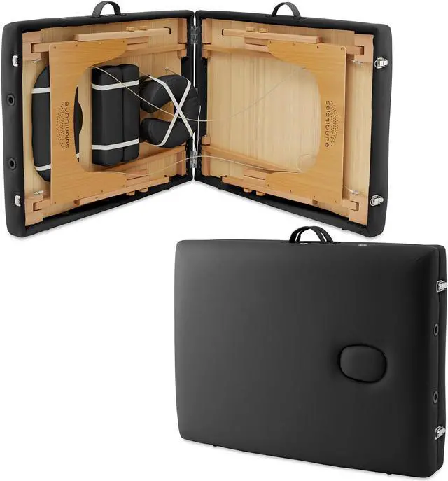 The table features professional-grade craftsmanship, including a sturdy hardwood frame along with double tension knobs on each leg for extra stability. Its support cables are composed of the same heavy-duty steel used in automobile brake construction, providing solid support for up to 500 pounds. Combining affordable value with performance, the Saloniture portable all-inclusive folding massage table package offers a complete massage solution. Includes a professional grade massage table, deluxe adjustable headrest, armrests, and a heavy-duty, nylon carry case with pockets.