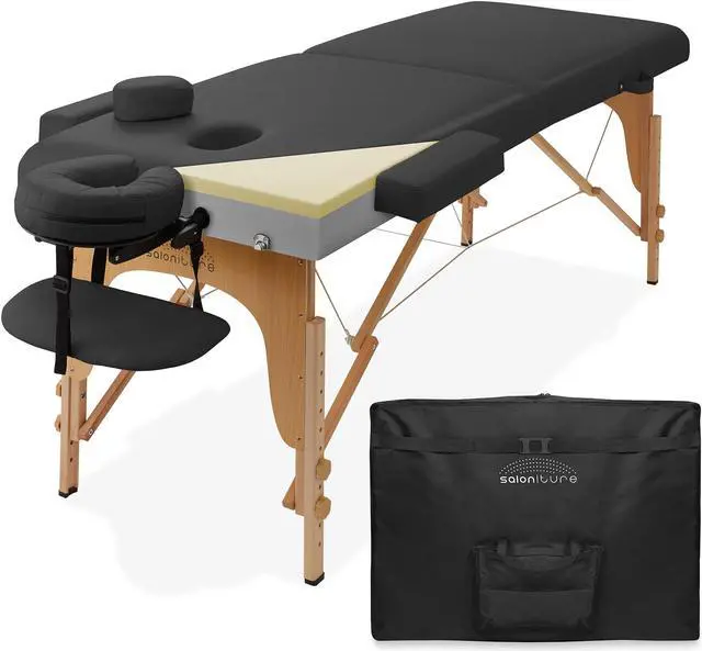 This Saloniture portable massage table combines luxurious comfort in a convenient, fold-and-carry design ideal for both certified massage therapists as well as at-home bodywork enthusiasts. This table offers premium comfort, ultra-padded with 4" of foam. 1-1/2" of specially designed memory foam atop 2-1/2" of our premium foam. This unique foam combination creates deluxe cushioning, providing the ultimate comfort for your clients. The armrest wings are composed of a plush, 2" thick layer of high-density foam, and the face pillow contains 3" of foam with a removable cover. Constructed with an adjustable headrest and removable winged armrests for additional customizable comfort.