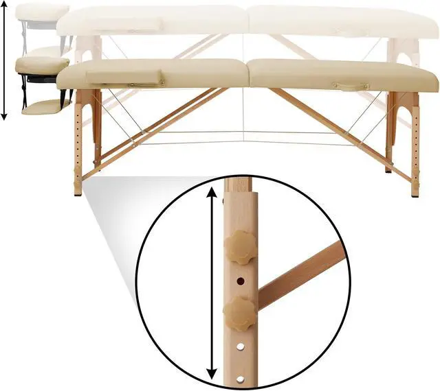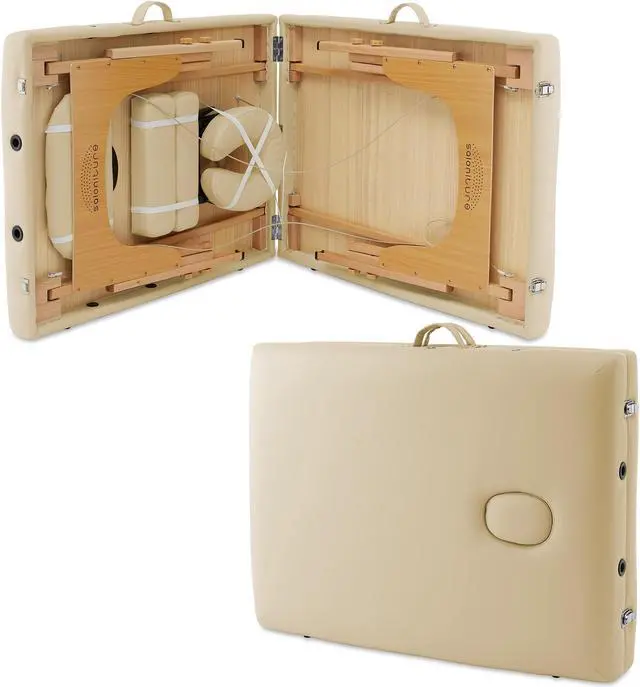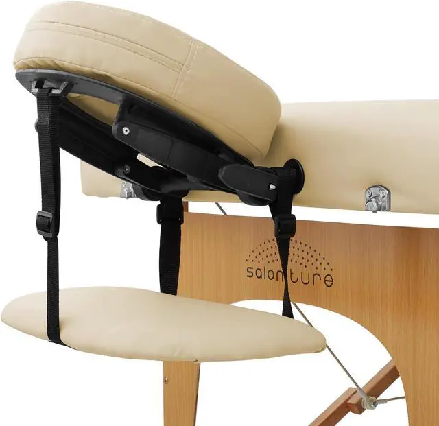 The table features professional-grade craftsmanship, including a sturdy hardwood frame along with double tension knobs on each leg for extra stability. Its support cables are composed of the same heavy-duty steel used in automobile brake construction, providing solid support for up to 500 pounds. Combining affordable value with performance, the Saloniture portable all-inclusive folding massage table package offers a complete massage solution. Includes a professional grade massage table, deluxe adjustable headrest, armrests, and a heavy-duty, nylon carry case with pockets.