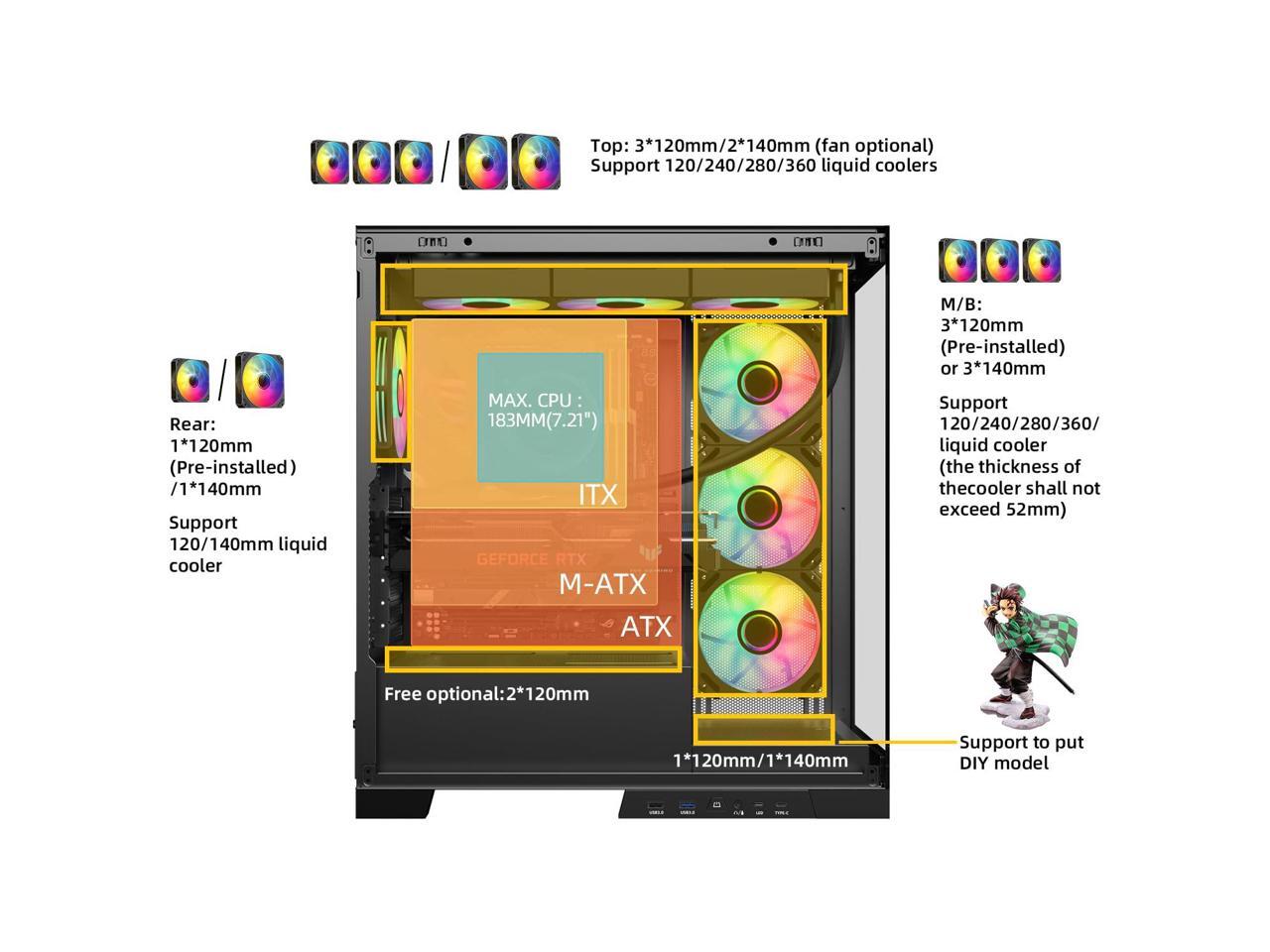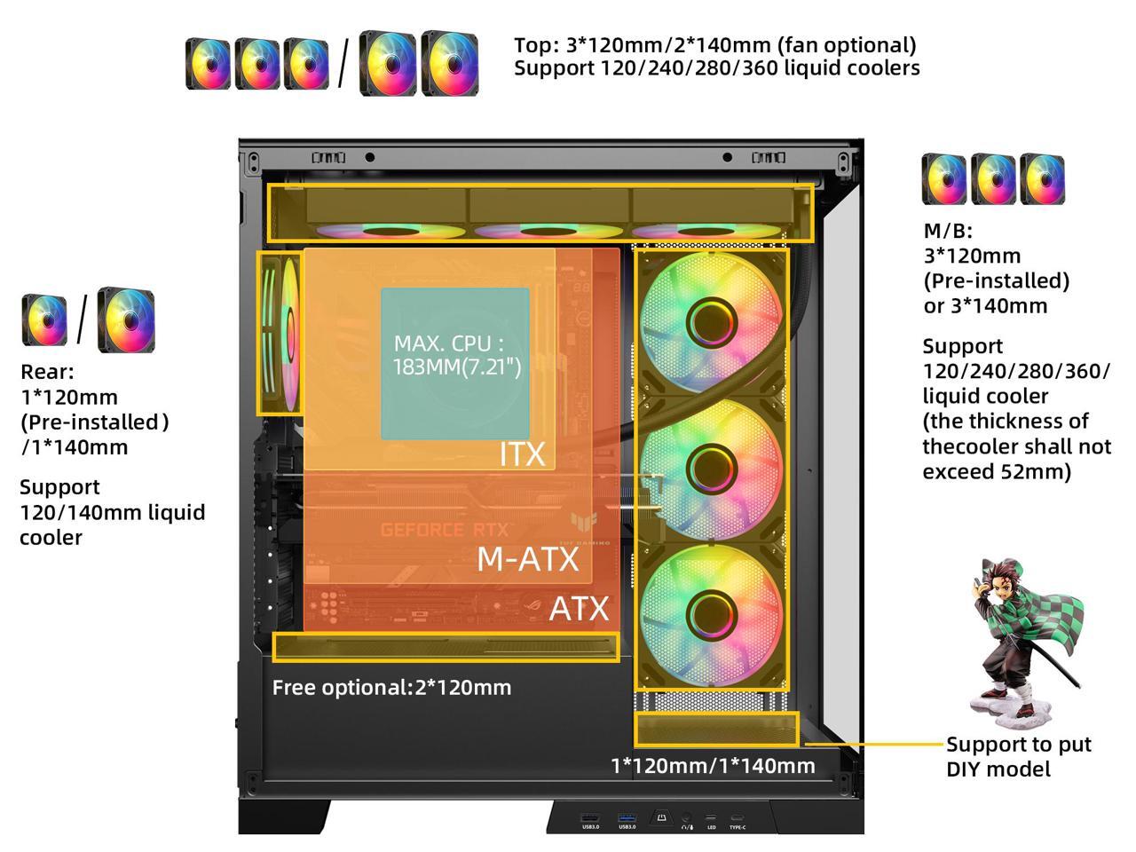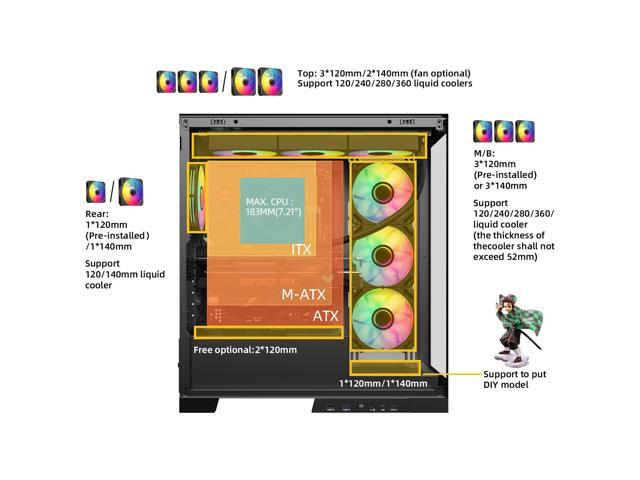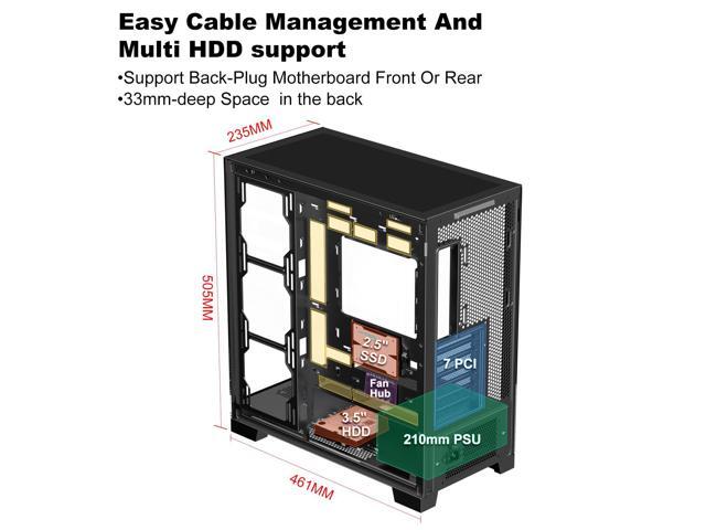 - Motherboard Compatibility: Supports ATX, mATX, and ITX motherboards, with support for M/B back plug-in design and a convenient 33mm space for scientific cable management.