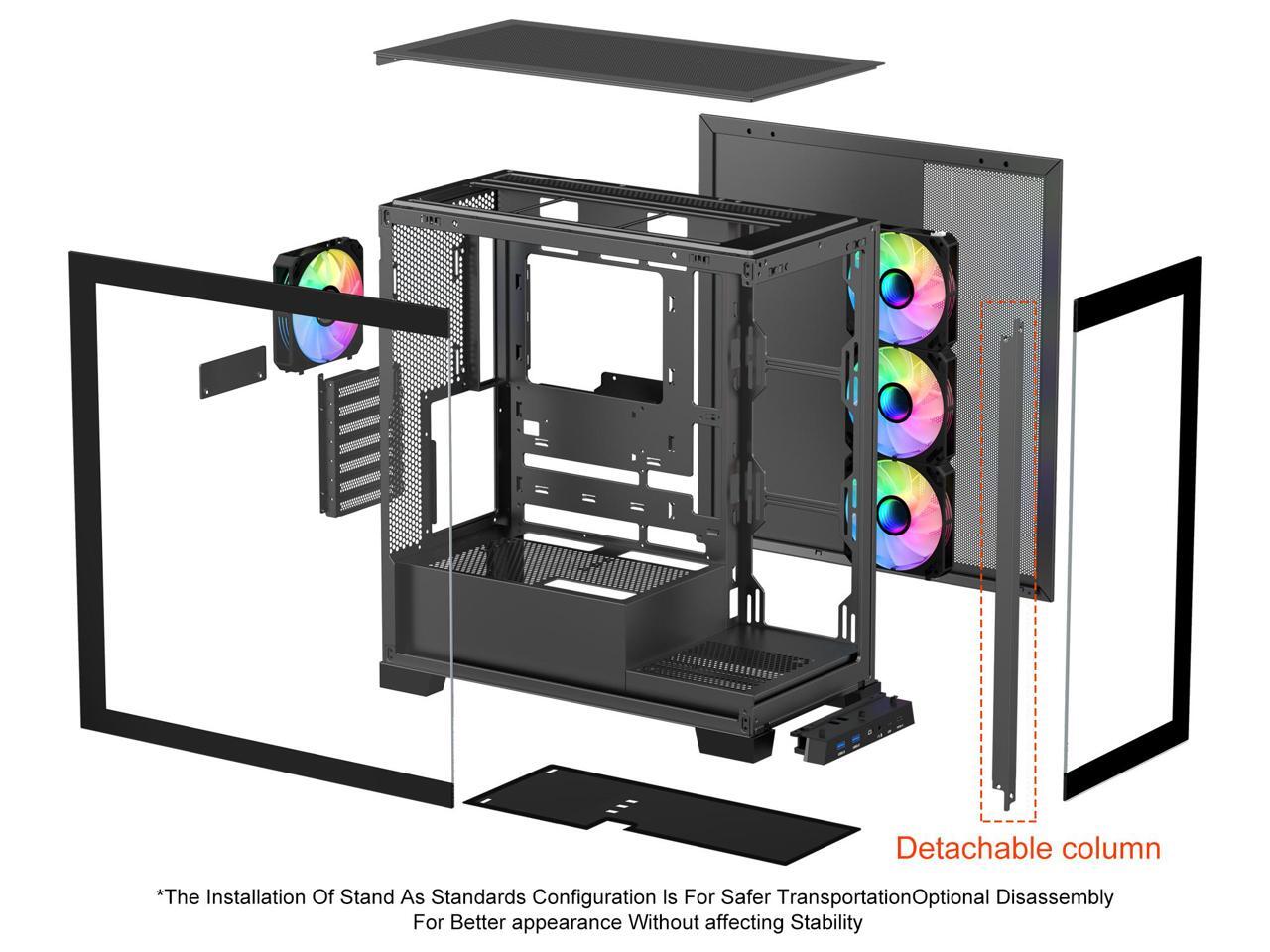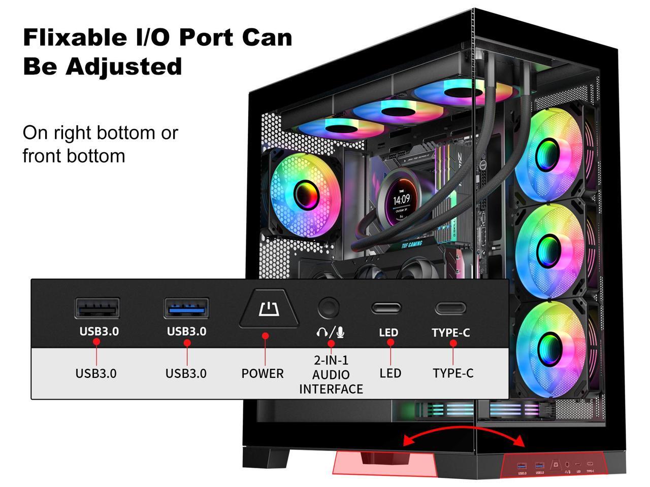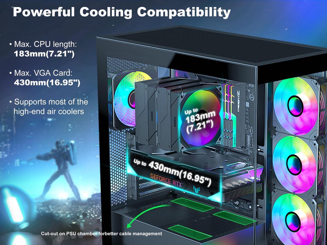 - Robust Cooling Performance: Pre-installed with 4 fans, featuring a 4+4 port fan hub. The top supports a 360mm liquid cooler, and the case can accommodate up to 10 fans.