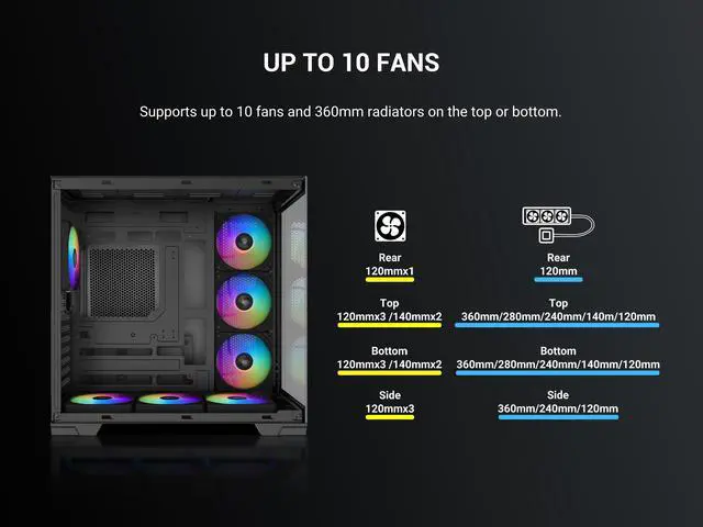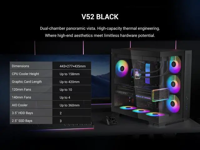 With support for 420mm GPUs, multiple 360mm radiators, and up to 9 fans, the V52 is ready for powerful gaming systems and advanced cooling setups.