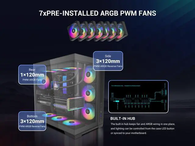 The case also supports back-connect motherboards for cleaner cable management and includes 7 PWM ARGB fans with a lighting hub for easy control.