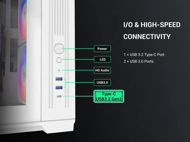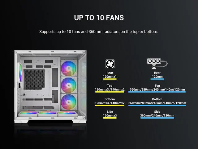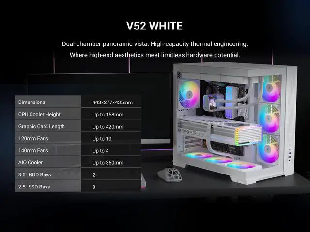 With support for 420mm GPUs, multiple 360mm radiators, and up to 9 fans, the V52 is ready for powerful gaming systems and advanced cooling setups.