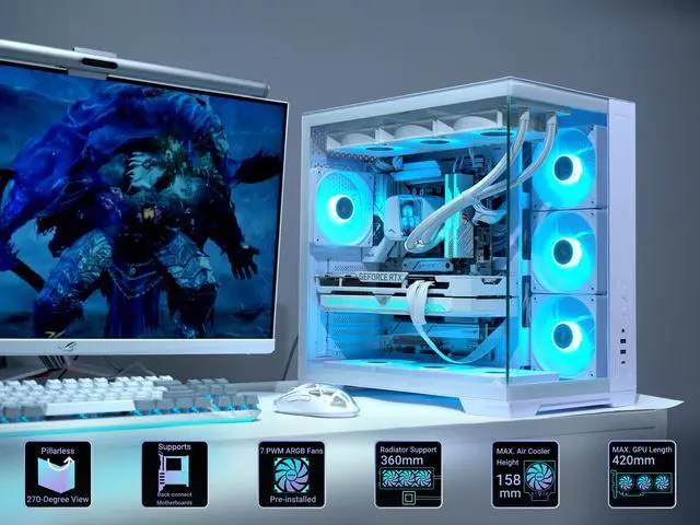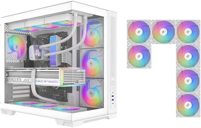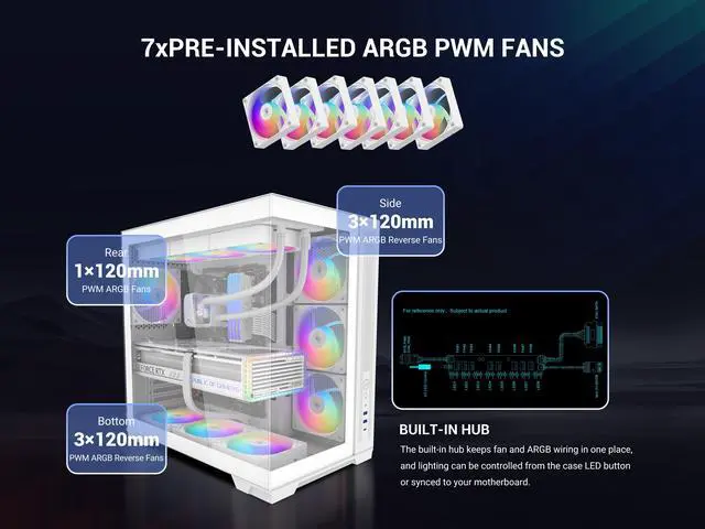 The case also supports back-connect motherboards for cleaner cable management and includes 7 PWM ARGB fans with a lighting hub for easy control.