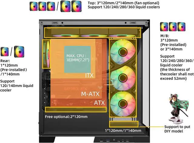Motherboard Compatibility: Supports ATX, mATX, and ITX motherboards, with support for M/B back plug-in design and a convenient 33mm space for scientific cable management.