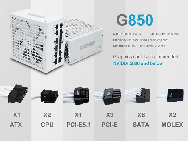 SAMA G850W ATX 3.1 Power Supply, 80+ Gold Efficiency, PCIE 5.1 Ready, Full Modular, 850W Power Supply, Japanese Capacitors, FDB Fan, White version