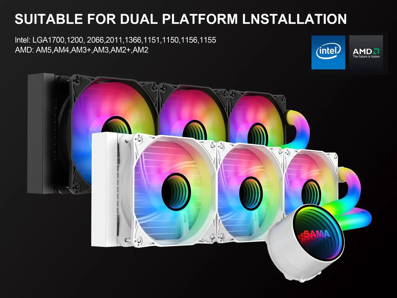 SAMA AIO Elite comes with a universally compatible CPU water-block, along with Infinity design on cooling head, Tubes with smooth and soft light effect. Closely ranked radiator, With a more efficient cold plate, spraying copper bottom, proprietary pump and fans optimized for static pressure to make sure the excellent heat transfer from cpu.