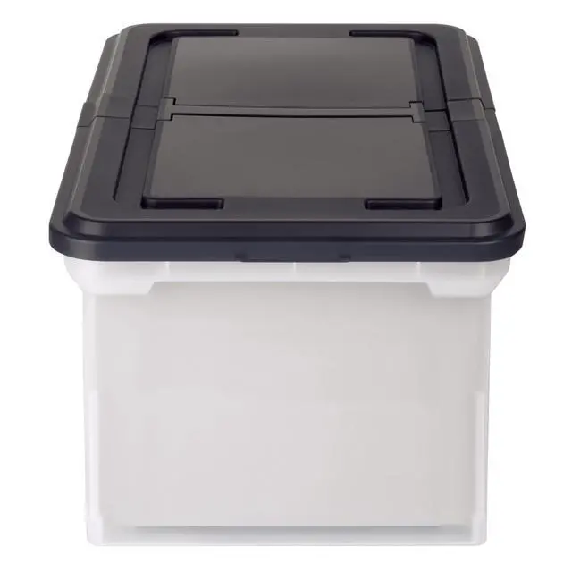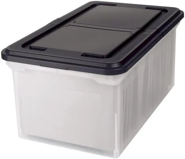 Office Depot stackable clear file box lets you see its contents without opening it.