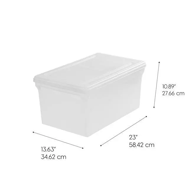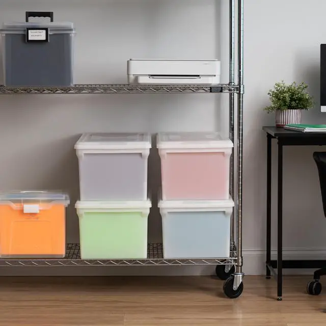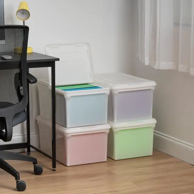 Keep your important documents organized and protected with the IRIS USA 44 Qt. File Box. Designed for convenience and durability, each plastic storage bin features a hinged split lid that allows easy access from either side without removing the entire top. These stackable and nestable file boxes are perfect for storing letter-size hanging files, tax records, and other essential paperwork, whether at home, in the office, or during a move. Made in the USA from durable, BPA-free plastic, the boxes are lightweight yet sturdy, making them easy to carry and long-lasting for everyday use. The pearl white finish gives a clean, professional look that fits seamlessly into any workspace or storage area. When not in use, the bins nest neatly to save space, providing a simple and efficient solution for keeping your paperwork tidy, secure, and accessible.