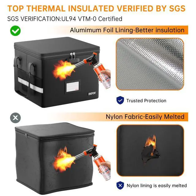 The Upgraded fireproof document box is made of thickened silicone coated fireproof cotton material and aluminum foil which withstand the temperature up to 5200?(double safe protection). Aluminum foil lining isn’t easily melt under high temperature after several tests.