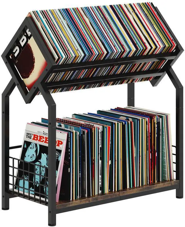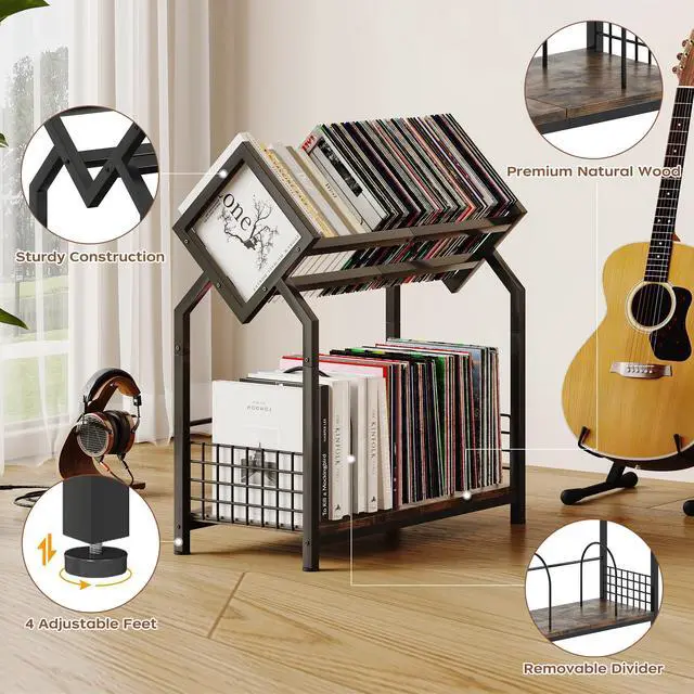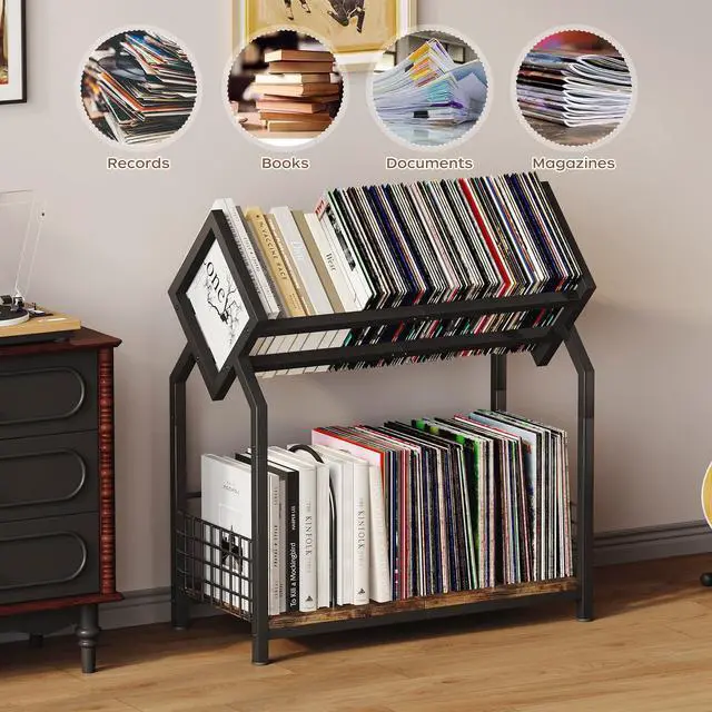Elevate your vinyl collection with this sleek and functional 2-tier record player stand. Crafted with sturdy materials, it provides ample storage space for your cherished records, while its elegant design seamlessly blends into any living space. The top tier offers a dedicated platform for your record player, ensuring optimal sound quality and easy access. Beneath, the spacious lower tier allows you to neatly organize your vinyl collection, keeping your favorite albums within reach. With its compact footprint, this stand maximizes vertical space, making it an ideal solution for smaller rooms or apartments. Effortlessly combine form and function with this stylish and practical record player stand.