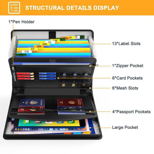 Large Storage Capacity :the size is 14.3x10.2x2 inch .It is large enough for store your important documents without wrinkling.Important document folder includes 6 card slots ,6 SD card slots ,4 mesh pockets ,one zipper pocket, pen slots,an open area in the middle.Document folder helps you organize your important documents in one place.Ensures that everything you need is readily accessible