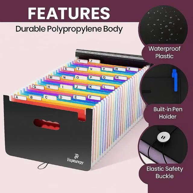 Stay organized with Heptazopy's durable accordion file organizer, designed for seamless document management. Made from quality waterproof PP material, this expandable file folder features 26 pockets to securely store everything from A4 papers and manuals to health reports and kids' artwork.