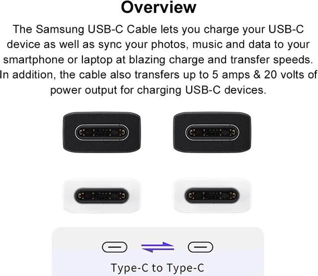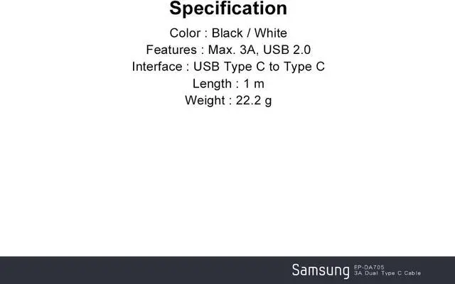 The Samsung USB-C Cable lets you charge your USB-C device as well as sync your photos, music and data to your smartphone or laptop at blazing charge and transfer speeds. UPS: 8801643993566 Weight: 22.2 g