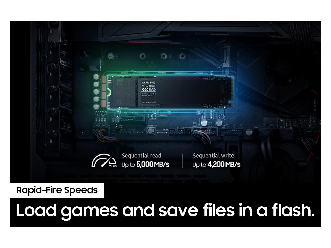 - READ/WRITE SPEEDS UP TO 5,000/4,200 MB/s: Load games and save files in a flash. Bring power to your productivity with read and write speeds of up to 5,000/4,200 MB/s.* The 990 EVO provides continuous speed to keep you going.