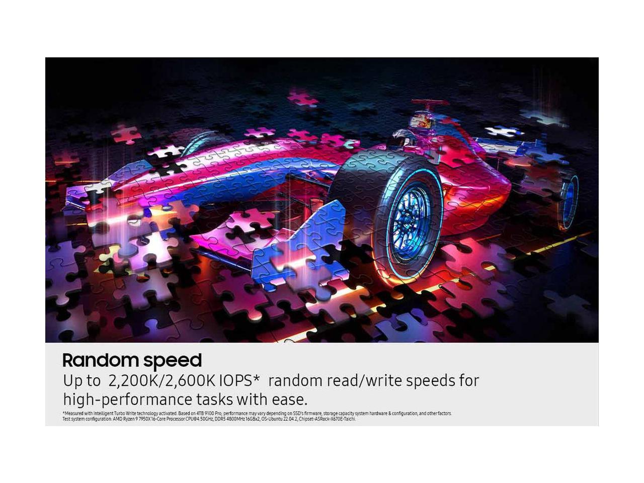 Boost AI Applications: The 9100 PRO with Heatsink SSD fuels seamless AI content creation, gaming, and more with random read/write speeds of up to 2,200K/2,600K IOPS.