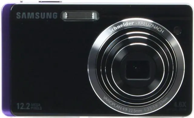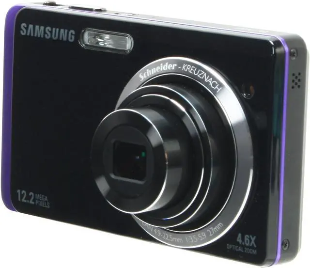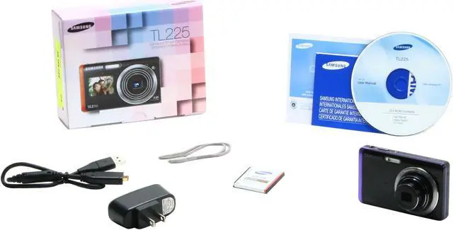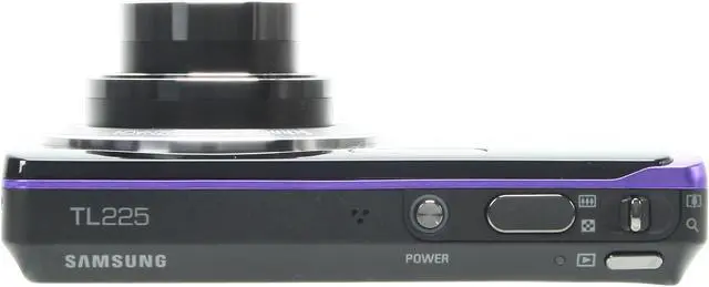 Experience a new level of convenience in digital photography with the Samsung DualView TL225 finished in stylish black and purple. This innovative camera features two LCD displays: one on the rear for the photographer and one on the front facing the subject. Now you can be part of the fun and take self-photos with ease. The days of accidentally cropping out your head are gone thanks to the front LCD that shows exactly what’s in frame. The front display can also show handy information like timer countdowns, shutter type and cartoon images to keep babies attentive and smiling.