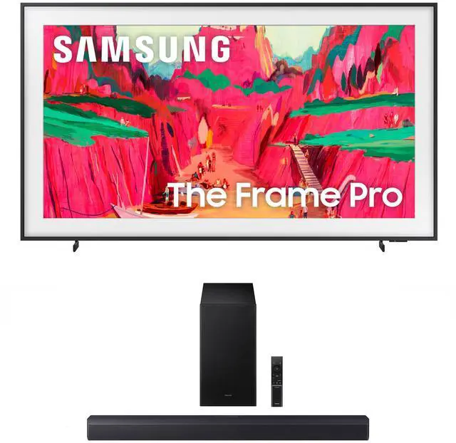 This bundle includes: (1) Samsung LS03FWFXZA 4K Neo TV with your choice of a Samsung Soundbar and Amber Screen Cleaner