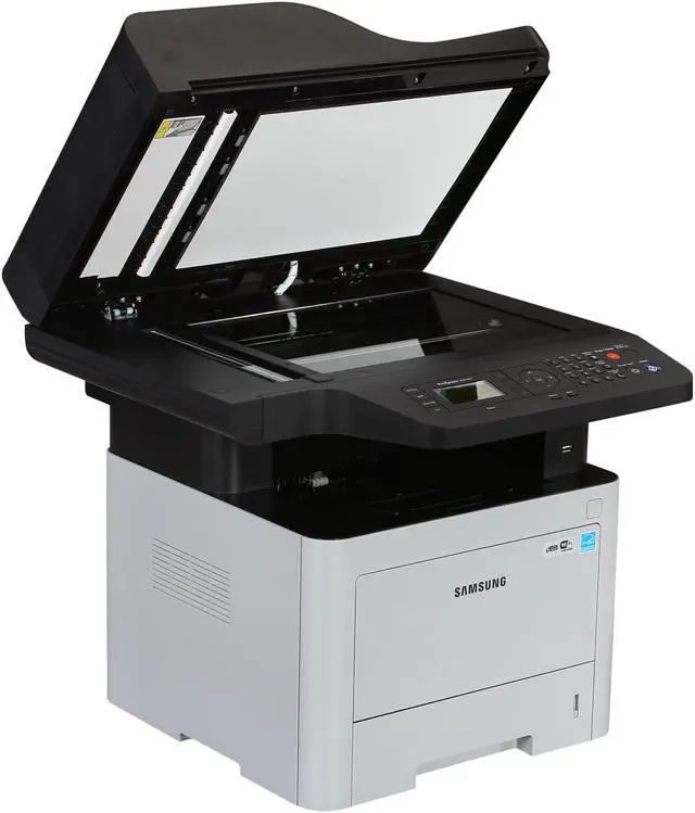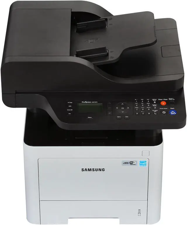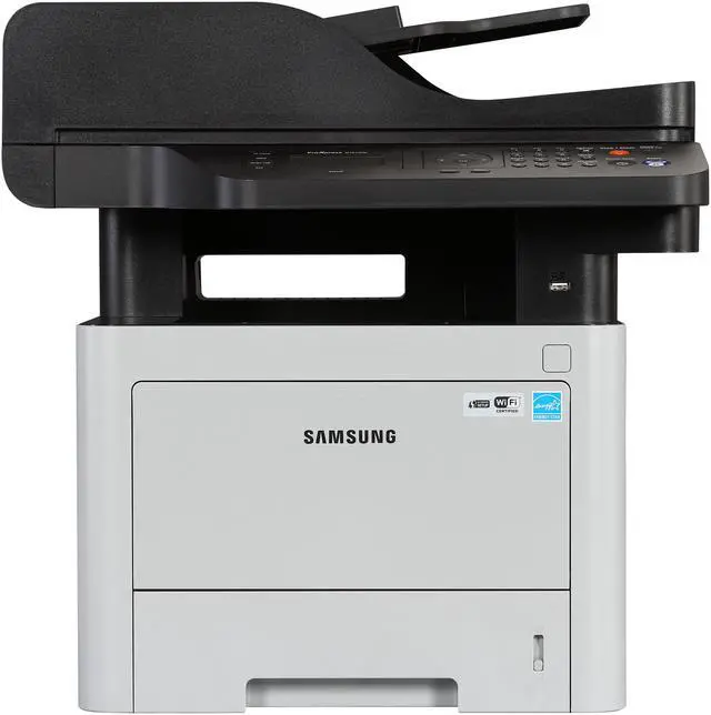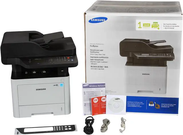 This wireless multifunction laser printer enables you to print, copy, scan, fax and PC-fax with unparalleled convenience, ease and speed. Cortex-A5 core processor and large built-in memory boost print and scan productivity with high quality results. ReCP Technology produces sharp and clean print and scan outputs. Produce professional-quality printouts with more reliable paper handling and support a range of media types. One Touch Eco Button supports cost and energy saving functions of 2-up/duplex printing, skipping blank pages and toner saving mode. Easy Eco Driver delivers cost savings by using less toner and paper. Printer manager facilitates printer management and monitoring. Use the Document Creator to compile and print complex documents in easy and fast manner. Secure printing jobs at the enterprise-security level with SyncThru? Admin. Machine Functions: Copy; Fax; Print; Scan; Printer Type: Laser; Maximum Print Speed (Black): 40 ppm; Network Ready: Yes.
