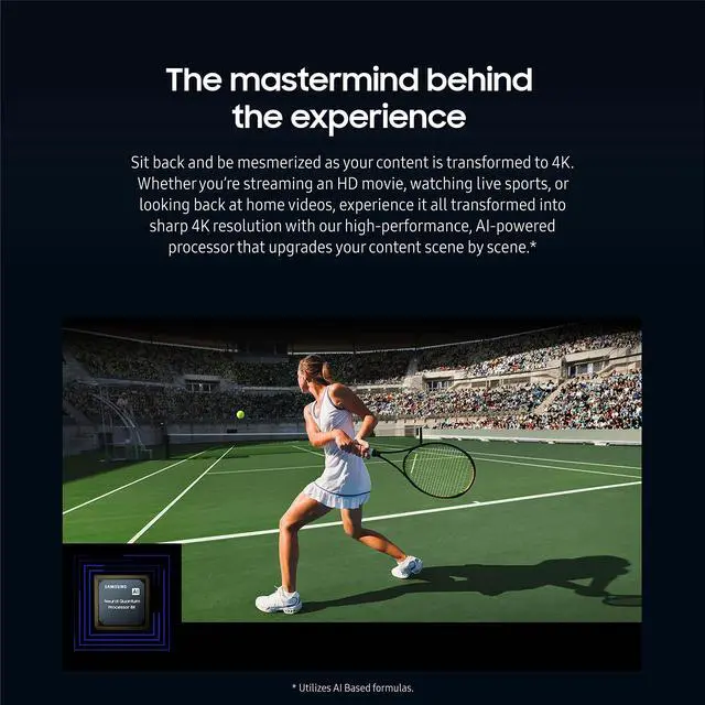 | Feature | Titan Black New Hexagon Plate Stand, Smart, Tizen, Universal Guide, Ambient Mode Plus, Multiple Voice Assistants, Samsung TV Plus, Multi View, SolarCell Remote, SmartThings Compatible, Samsung Health, Meet, Telemedicine, ConnecTime, Gaming Hub, 4 HDMI, Fixed Rate Link, VRR, eARC, 2 USB, LAN, WiFi, Bluetooth, RS232C, IP Control, Optical, Dolby Atmos, Object Tracking Sound Lite, Q-Symphony 3.0, Active Voice Amplifier, 2.2ch Speakers, Filmmaker Mode, 4K UHD Connected, VESA 600 x 400 |