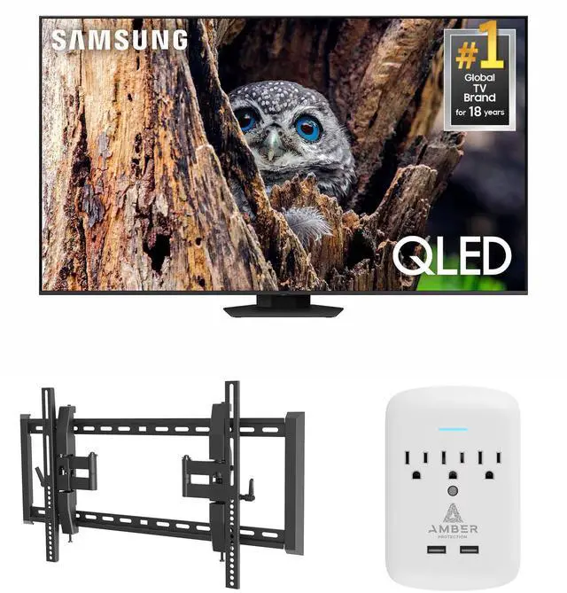 This bundle includes: (1) Samsung Q80DD 4K Smart TV with (1) Walts TV Wall Mount and (1) Amber Protection 3-OUTLET-SURGE Surge Protector.