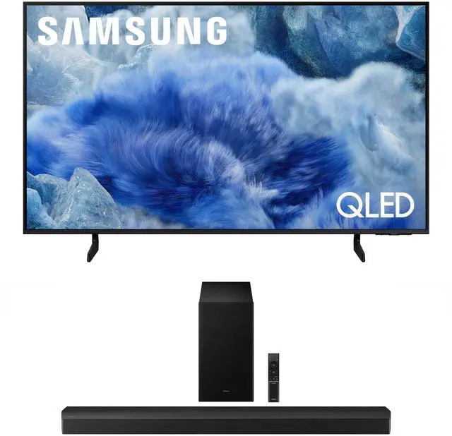 This bundle includes: (1) Samsung Q8F TV with your choice of a Samsung Soundbar and Amber Screen Cleaner