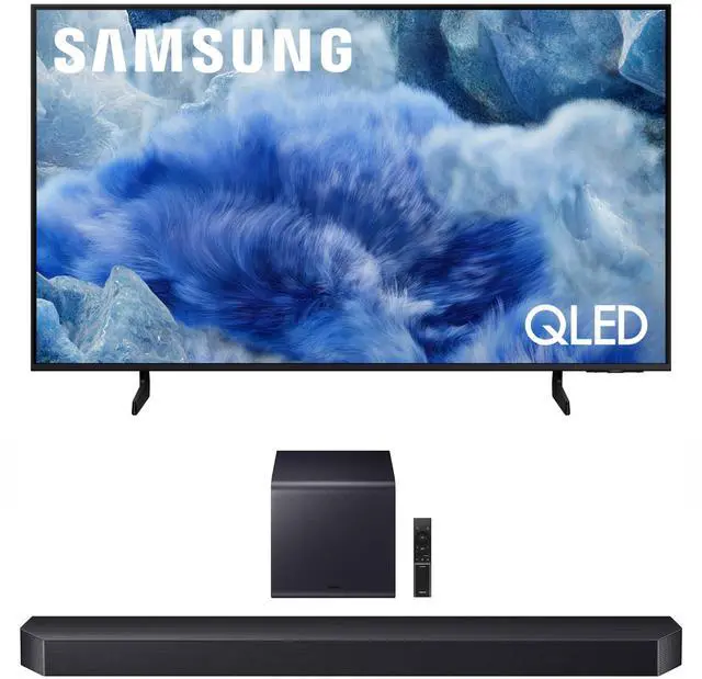This bundle includes: (1) Samsung Q8F TV with your choice of a Samsung Soundbar and Amber Screen Cleaner