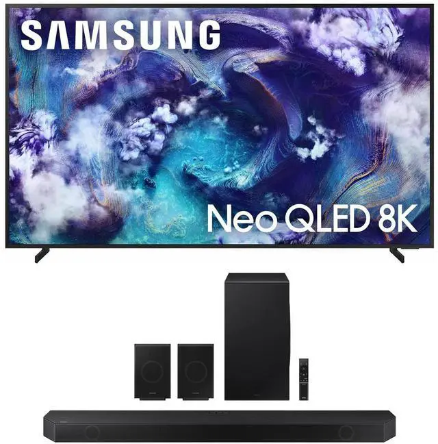 - (Titan Black) with a Samsung HW-Q990D Soundbar and Subwoofer - Q-Symphony - 11.1. 4 Channel - True Dolby Atmos Sound - Wireless Dolby Atmos - Up/Side-Firing Rear Speakers Included - Smart Integration - SpaceFit Sound Pro - Adaptive Sound - Game Mode Pro - Active Voice Amplifier - Tap Sound - Surround Sound Expansion - Voice Enhance - Night Mode - Auto AV Sync - Dolby TrueHD - Dolby Digital Plus - Dolby MAT - DTS Express - Wide Range Tweeter - Hi-Res Audio Decoding - 4K Video Pass - HDR 10 Plus - One Remote Control - 2x HDMI In - HDMI Out - eARC - CEC - Bluetooth - Optical - Voice Assistant Compatible - Airplay 2 - Spotify Hi-Fi Connect - Tidal Hi-Fi Connect -