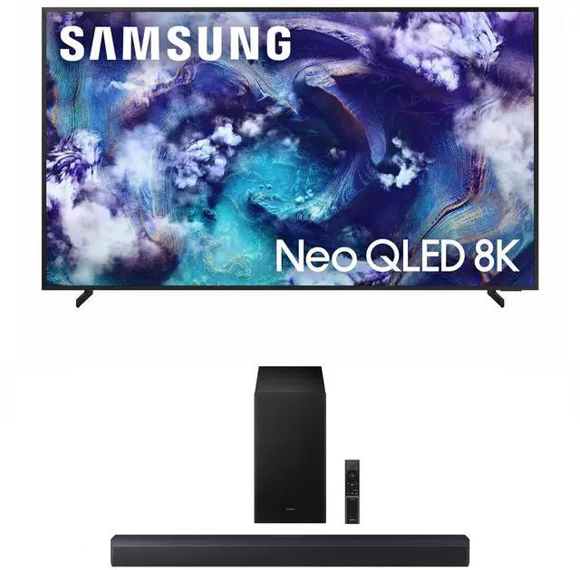 This bundle includes: (1) Samsung QN900F 4K Neo QLED TV with your choice of a Samsung Soundbar and Amber Screen Cleaner