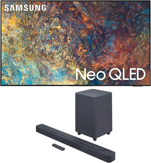 Samsung QN98QN90AA Neo QLED 4K Smart TV - Neo Quantum Processor 4K - HDR 10+ Certified - Quantum Matrix Contrast - 3840 x 2160 Resolution - Motion Rate 240 - Ultra Viewing Angle - Contrast Enhancer - Auto Motion Plus - LED Clear Motion - Dolby Digital Plus - Dolby 5.1 Decoder - Object Tracking Sound - Q-Symphony - Dialog Enhancement - 60W Sound Output - 4.2. 2 Channel Speakers - Woofer - Multiroom Link - Bluetooth Audio - Tizen Smart Service Operating System - Web Browser - Voice Activated Assistant - 600 x 400 VESA - TV to Mobile Mirroring - Mobile to TV Mirroring - Auto Game Mode - Game Motion Plus - Super Ultra Wide Game View - Wifi - Bluetooth - Adaptive Picture - Active Voice Amplifier - Adaptive Sound Plus - AI Upscale - Brightness/Color Detection - Office 365 Cloud Service - English, Spanish, and French OSD Language - 4 HDMI - 2 USB ( 2.0 ) - Optical - RS-232C - Ethernet - ARC - eARC - HDMI Quick Switch - 4 Bezel-Less - Solid Slim - Bending Plate Stand (Sand Black) - Eco Sensor - Solar Cell Remote - ( 86.00"W x 14.40"D x 51.90"H ) - (Titan Black) with a JBL BAR-500 Soundbar and Subwoofer - MultiBeam - Dolby Atmos - 3D Surround Sound - PureVoice Technology - Multiple Streaming Options - 590W Total Power - 290W Soundbar - 300W Subwoofer - 4x 46x90mm Racetrack Drivers - 3x 0.75" Tweeters - 10" Subwoofer - 35Hz-20kHz Frequency Response - Optical - Bluetooth - USB A - Wi-Fi - 1x HDMI In - eARC - HDR10 - Dolby Vision - 5.1 Channel - Works with Voice Assistant Enabled Speakers - 4K Pass Through - Easy Sound Calibration - JBL One App - Box Includes Remote with Batteries, Power Cords, HDMI Cable, Wall Mount Bracket and Template, Quick Start Guide - Soundbar: ( 40.00"W x 4.00"D x 2.20"H ) - Subwoofer: ( 12.00"W x 12.00"D x 17.30"H ) - (Black)