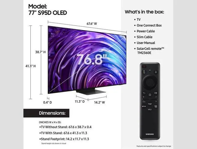 Samsung QN77S95DDFXZA 77" OLED 4K Smart TV - OLED Technology - OLED Glare Free - OLED HDR Pro - Dolby Atmos and Object Tracking Sound+ - Auto HDR Remastering - Motion Xcelerator 144Hz - Slim Design - Real Depth Enhancer - 4K AI Upscaling - NQ4 AI Gen2 Processor - EyeComfort Mode - Auto Game Mode - Filmmaker Mode - Q-Symphony - Active Voice Amplifier Pro - Adaptive Sound Pro - 360 Audio - 70 Watt 4.2. 2 Ch - Samsung Tizen OS - Multi View - Built-in Voice Assistant - 4 x HDMI - LAN Port - 3 x USB-A, 1 USB-C - Wi-Fi 5 - Bluetooth - Optical - VESA 400 x 400 - SolarCell Remote, One Connect Box Included - ( 67.6"W x 11.3"D x 41.3"H )