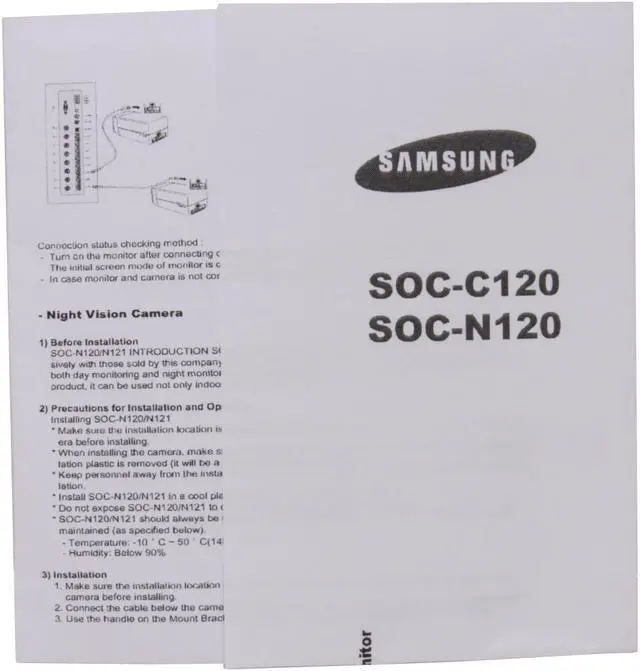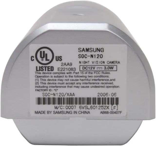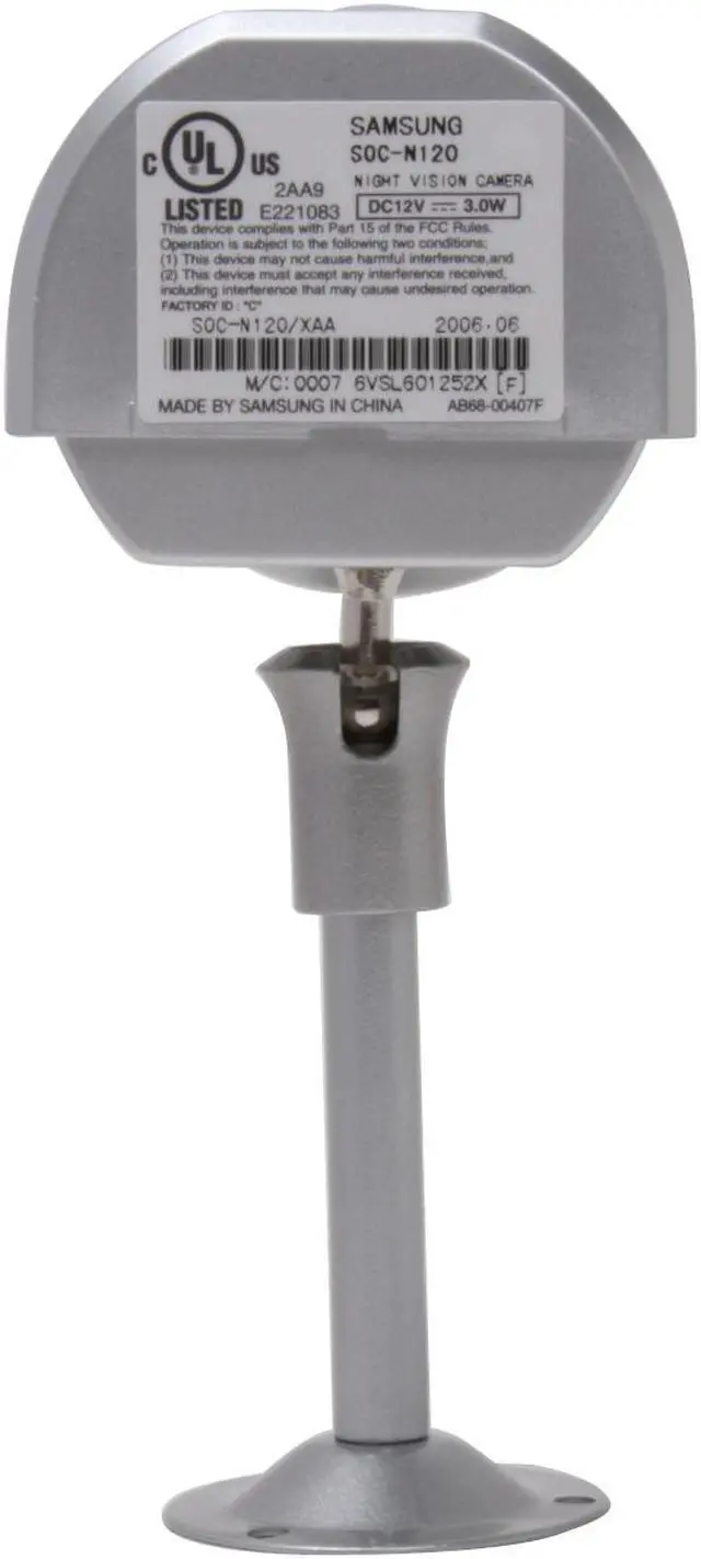 | Features | SAMSUNG CM SOC-N120 Color, Weather Resistant* 1P42 GRADE) Light Sensor Auto Switching 1R LED Control, Wide Angle (3.8mm), DC 12V. Optional camera for SAMSUNG DIY S'N : 48 dB Min. illumination : Normal: 2 Lux Night mode : IR LED ON 2-Way Audio (Microphone. Speaker) Weather Resistant (IP42 Grade) Light sensor Auto Switching IR LED Control 10pes SBR-110(Mount Bracket) |