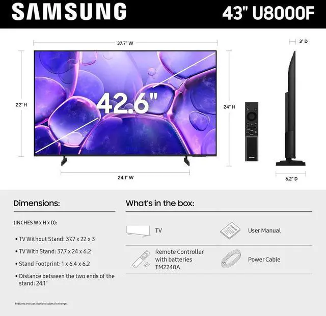 Samsung UN43U8000FFXZA 43" (2025) - Crystal Processor 4K - MetalStream Design - Samsung Knox Security - Endless Free Content - 4K Upscaling - Motion Xcelerator 60Hz - HDR - Color Booster - Object Tracking Sound Lite - Q-Symphony - Mega Contrast - Contrast Enhancer - HDR10+ - WiFi - Bluetooth - HDMI (3x) - USB (1x) - Ethernet (1x) - RF Connection (1x) - Home Insight - Universal Gestures/Quick Control - One UI Tizen -