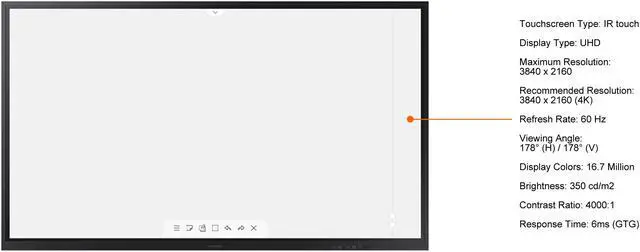 | Features | Key: Flip App Orientation: Landscape Special: H/W "Touch Overlay(IR), Front Connectivity, OPS I/F Support(w/OPS Box) Built in Speaker(10W x 2), WiFi/BT Module Embedded" S/W