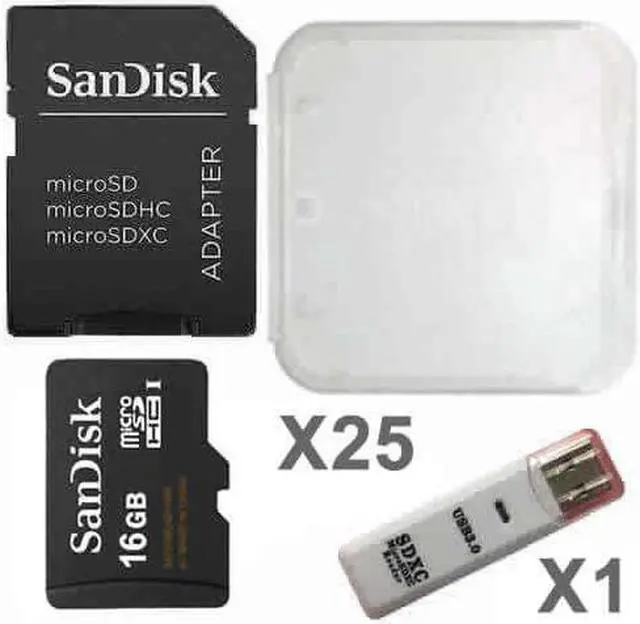 SanDisk Kit of Qty 25 x Sandisk 16GB mSDHC SDSDQAB-016G Card with Plastic Cases, SD Adapters and 1 USB Reader