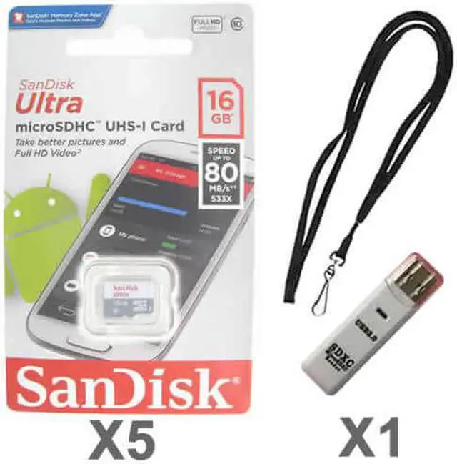 SanDisk Kit of 5 x Sandisk Ultra 16GB mSDHC SDSQUNS-016G-GN3MN Card with 1 x Lanyard and 1 x USB Reader