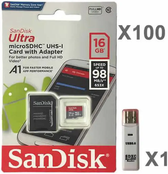SanDisk Kit of Qty 100 x SanDisk Ultra 16GB microSDHC SDSQUAR-016G-GN6MN with 1 USB Reader