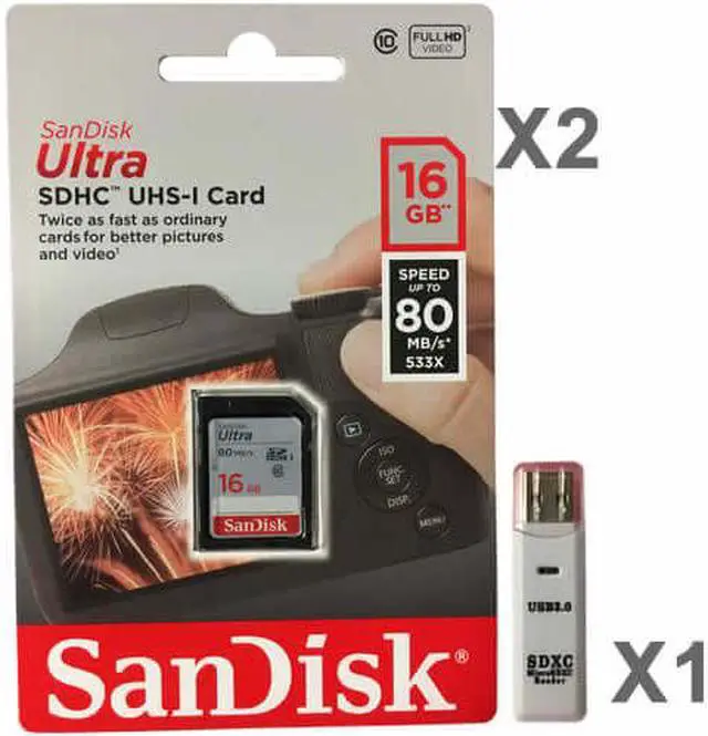 SanDisk Kit of Qty 2 x Sandisk 16GB SDHC SDSDUNC-016G-GN6IN Card with 1 USB Reader