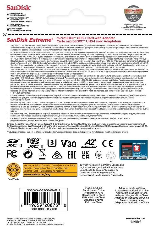 Engineered to withstand extreme conditions, it is temperature-proof, humidity-proof, waterproof, shock-proof, drop-proof, magnet-proof, X-ray-proof, and wear-out-proof, ensuring durability and reliability in any environment. In case of accidental file deletion or corruption, the included RescuePRO Deluxe data recovery software offers peace of mind by allowing you to recover and restore a wide range of file formats for one year. Built to endure, SanDisk Extreme microSD cards are backed by a lifetime limited warranty, ensuring long-term performance and stability. Trusted by photographers worldwide, SanDisk is synonymous with reliability and excellence in digital storage solutions.