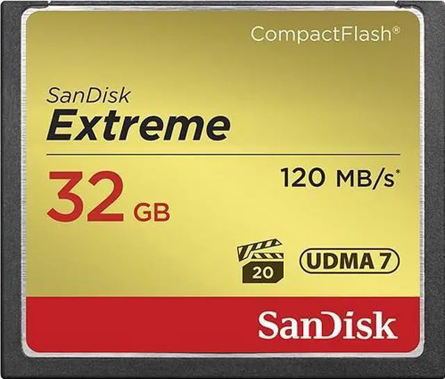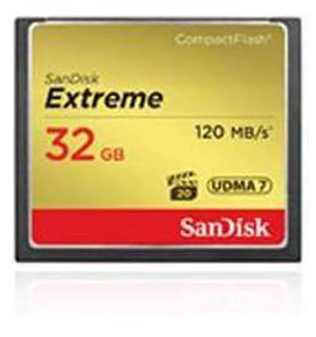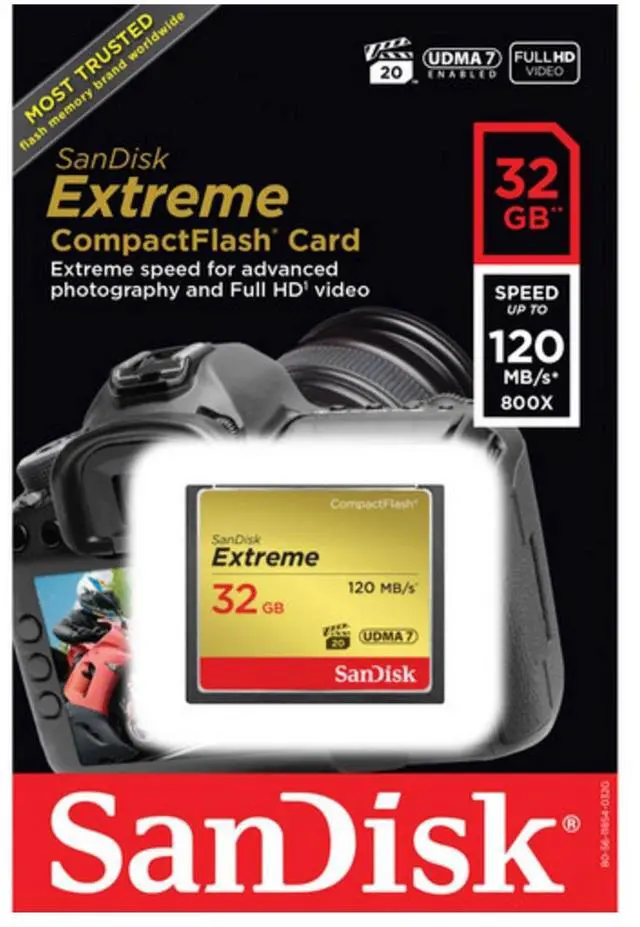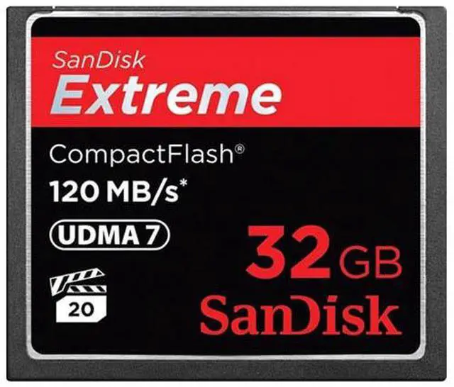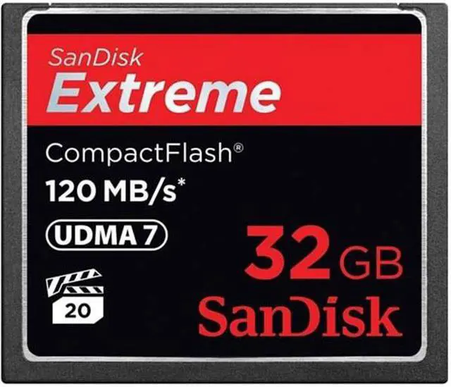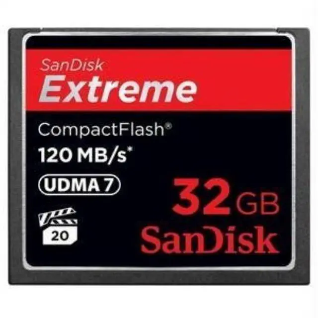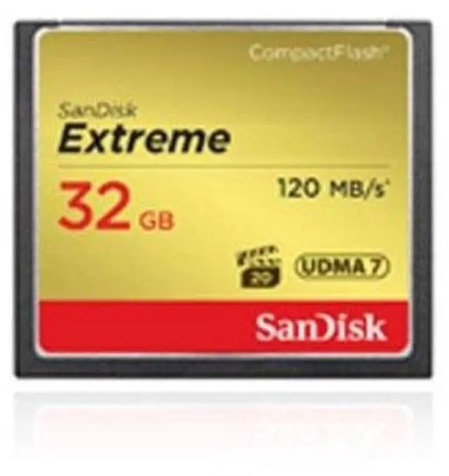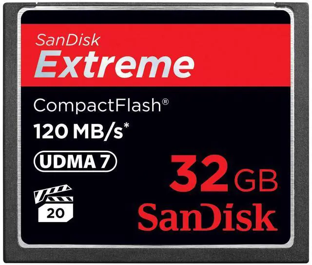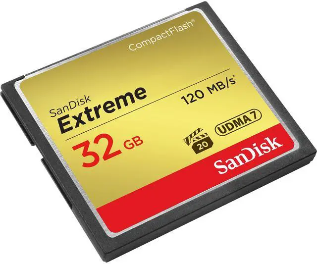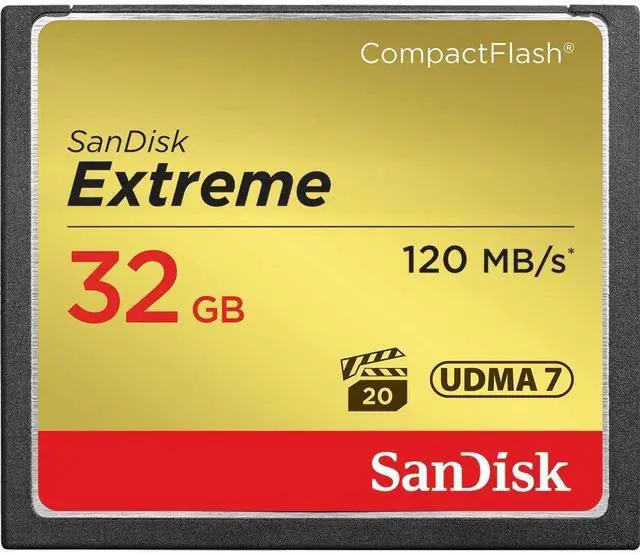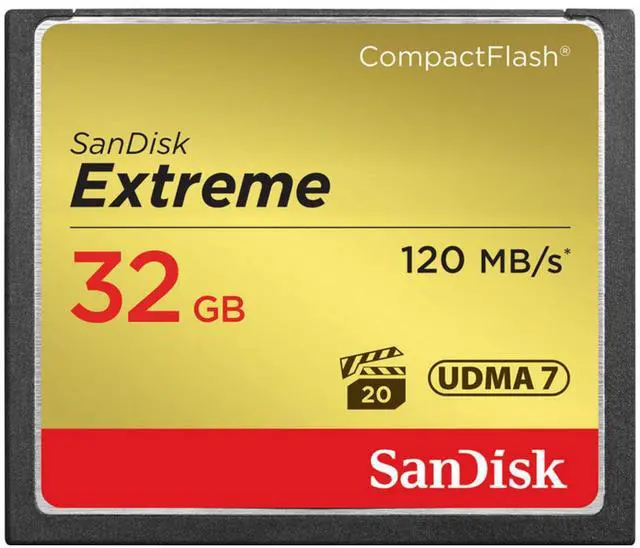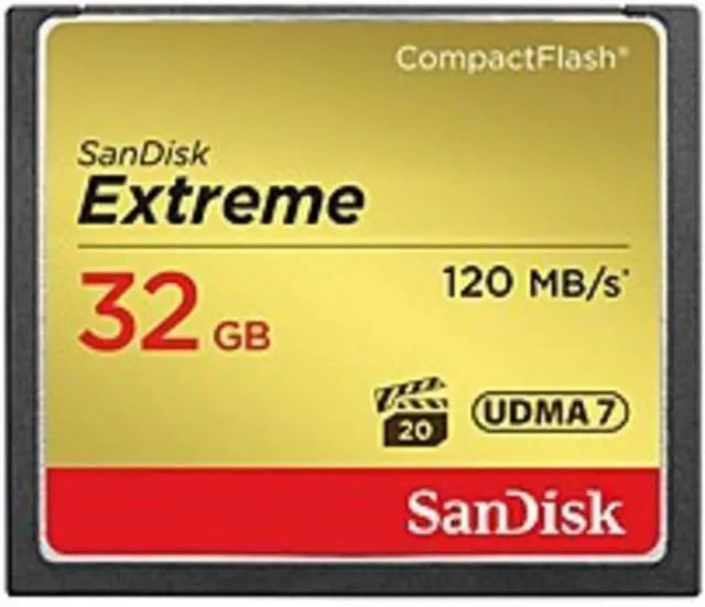 The optimal combination of shot speed (up to 60MB/s), sustained video performance guarantee (VPG-20), and transfer speed (up to 120MB/s; 16GB - 128GB cards only. Ideal for use with mid-range to high-end DSLR cameras and HD camcorders, the SanDisk Extreme CompactFlash Memory Card delivers first-rate read/write speeds to catch fast action shots and enable quick file transfers. This memory card features Video Performance Guarantee (VPG-20) to deliver a minimum sustained recording data rate of 20MB/s to support high-quality Full HD video (1080p) recording. Take advantage of burst-mode photography with the card's write speeds of up to 60MB/s (400X) and enjoy efficient workflow with its transfer speeds up to 120MB/s (16GB - 128GB cards only). With capacities up to 128GB, this memory card provides plenty of storage for Full HD videos and RAW photos.Number of Memory Cards: 1Storage Capacity: 32 GBMaximum Read Speed: 120 MBpsMaximum Write Speed: 60 MBpsGreen Compliant: YesGreen Compliance Certificate/Authority: EU RoHSGreen Compliance Certificate/Authority: REACHLimited Warranty: Lifetime