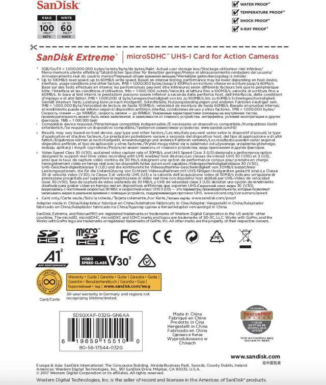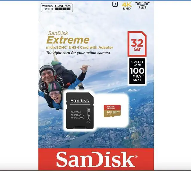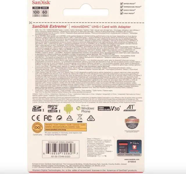 Capture more fast-action and record more 4K UHD and Full HD video with your android based smartphone, interchangeable-lens camera, drone or GoPro action camera. Sandisk Extreme microSD UHS-I Cards are built tough for extreme durability under challenging environmental conditions. Extreme speeds let you capture every detail of adventure and take the wait out of transferring your videos between devices. A storage capacity of 32GB expands your device's memory and lets you record 4K UHD video. Sandisk products are constructed to the highest standards and rigorously tested. You can be confident in the outstanding quality, performance and reliability of every Sandisk product.