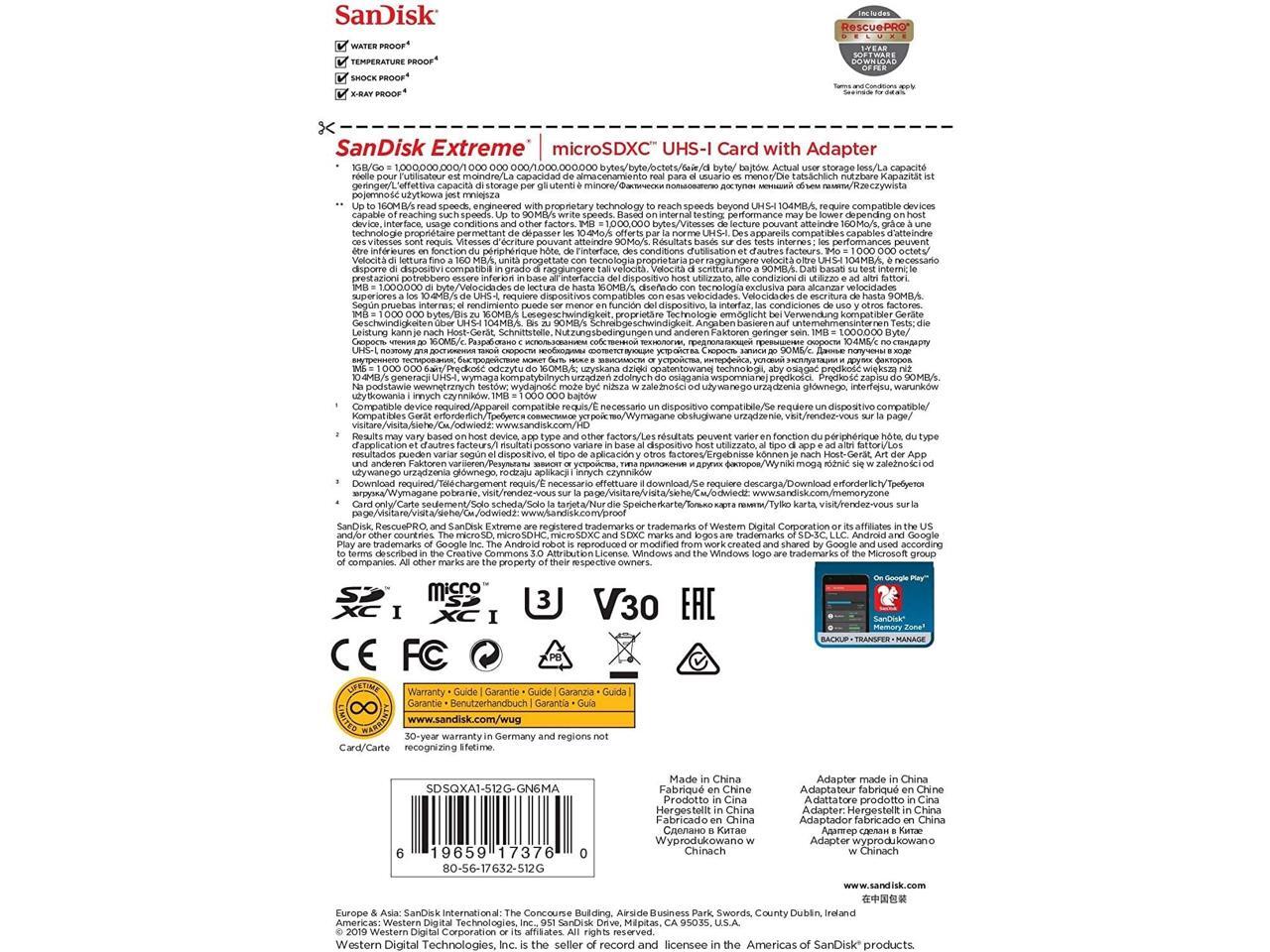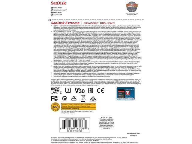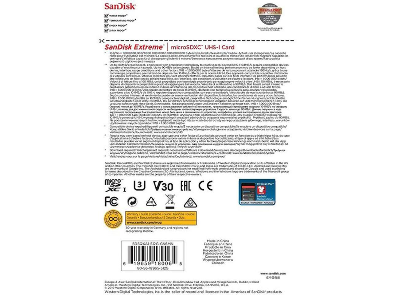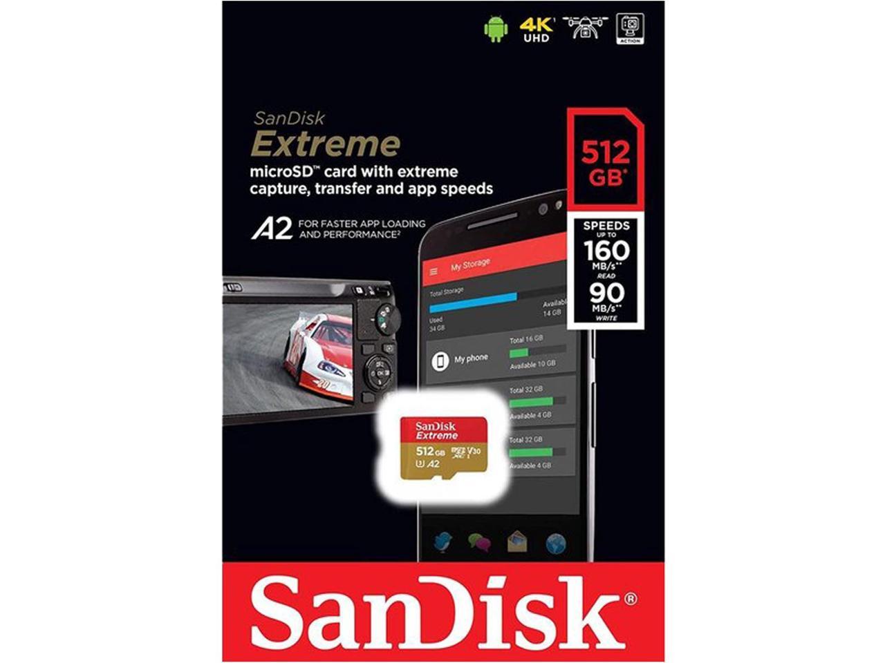 SanDisk SDSQXA1-512G-GN6MN MAS 512GB 8pin microSDXC r160MB/s w90MB/s C10 U3 V30 A2 UHS-I SanDisk Extreme microSDXC Memory Card w/o Adapter