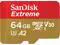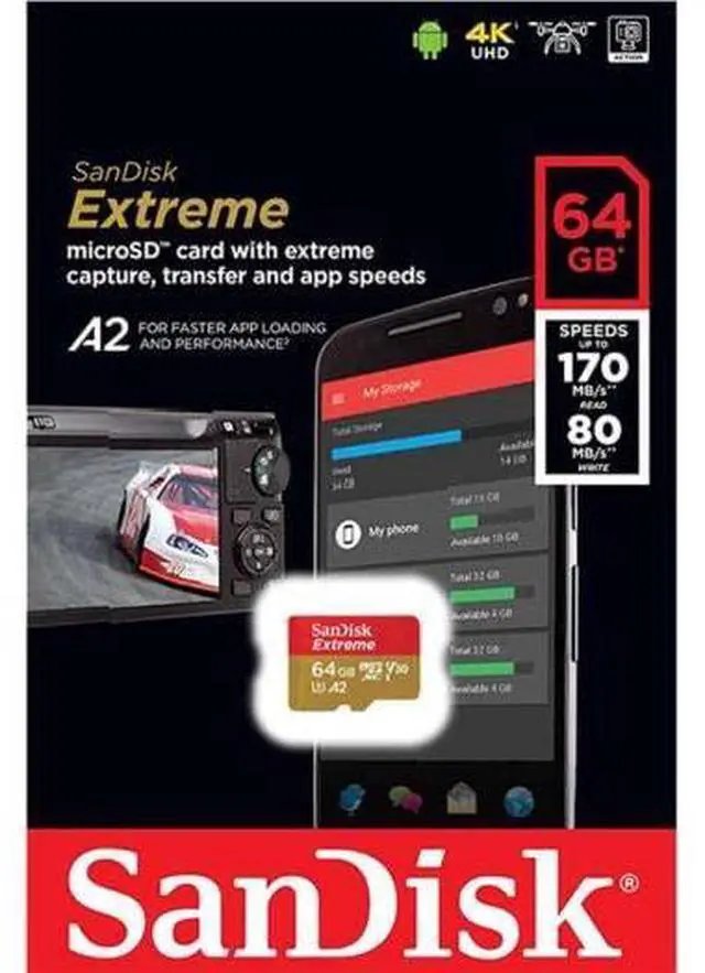 The SanDisk Extreme microSDXC memory card lets you save time transferring media with read speeds of up to 170MB/s powered by SanDisk QuickFlow Technology . Pair with the SanDisk Professional PRO-READER SD and microSD to achieve maximum speeds (sold separately). With write speeds up to 80MB/s its ideal for your Android smartphone, action cameras, or drones. This high-performance microSD card handles 4K UHD video recording, Full HD video, and high-resolution photos.