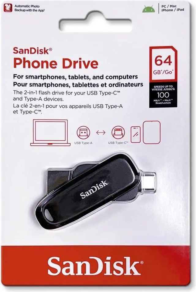 Looking for storage that works across your USB Type-C and Type-A devices? The flexible and convenient SanDisk Phone Drive lets you seamlessly move files between your USB Type-C smartphone, tablet, and Mac and USB Type-A computer. Transfer files quickly with read speeds up to 100MB/s. Now you can take even more photos, and access and share them across your devices without missing a beat.