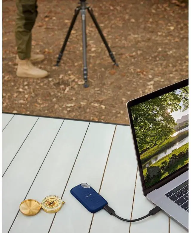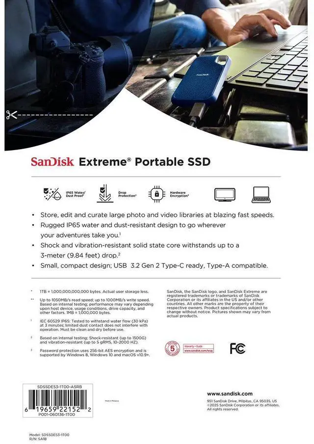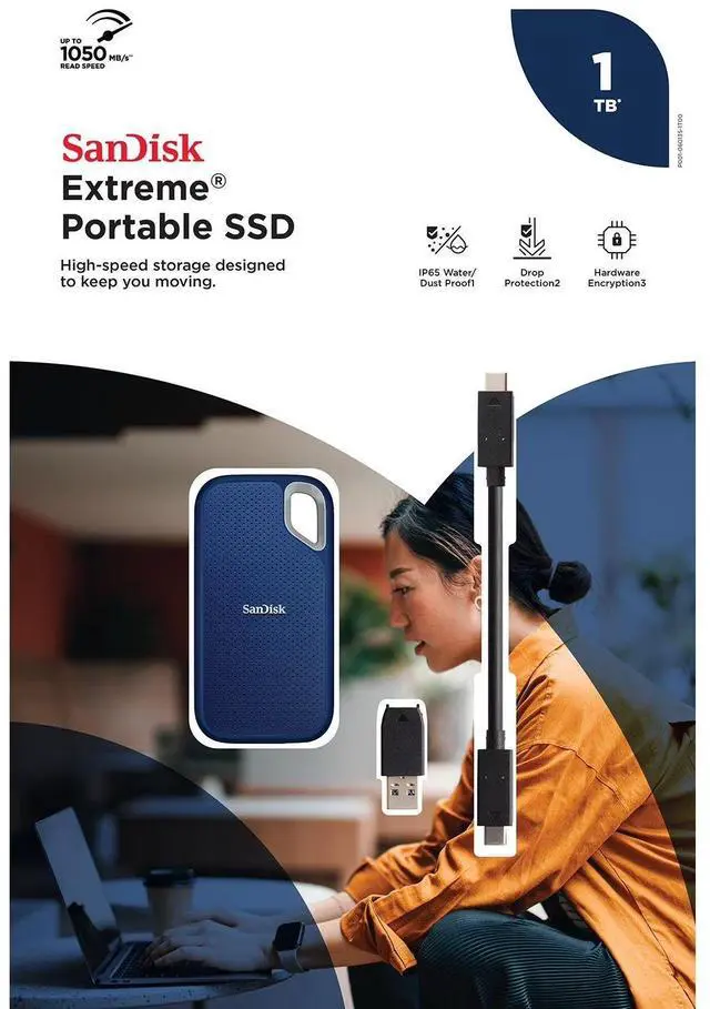Tough Storage That's Ready for LifeYour life's an adventure. The SanDisk Extreme Portable SSD fits your mobile lifestyle and accelerates every move. Nearly 2x as fast as our previous generation! Powerful yet PortableGet fast NVMe solid state performance featuring 1050MB/s read and 1000MB/s write speeds in a portable, high-capacity drive that's perfect for creating amazing content or capturing incredible footage. Tough Enough to Take with YouUp to two-meter drop protection and IP55 water and dust resistance mean this durable drive can take a beating. Travel Worry-FreeGet extra peace of mind with a 5-year limited warranty and a durable silicon shell that offers a premium feel and added protection to the drive's exterior.