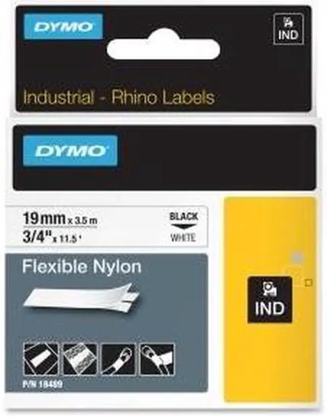 DYMO - Flexible nylon tape - black on white - Roll (0.75 in x 11.5 ft) - 1 roll(s) - for DYMO 1000 Plus; LabelMANAGER 100; Rhino 4200, 6000, 6000 Hard Case Kit; RhinoPRO 5000Flexible Nylon is specifically designed for wire and cable marking. Idem. UL Recognized Component to UL969.